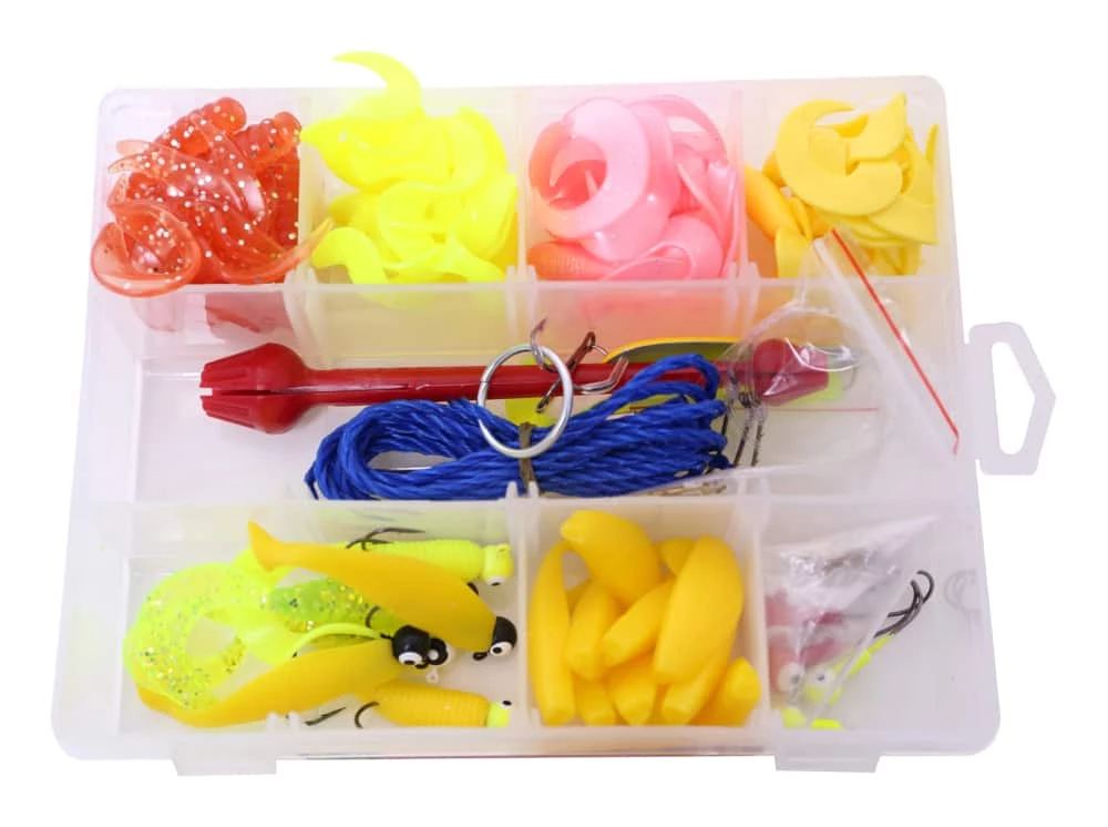 - 80 piece walleye lure kit contains: jigs, shads, grubs, spoons, swivels, snells, hooks, stringer and a hook remover